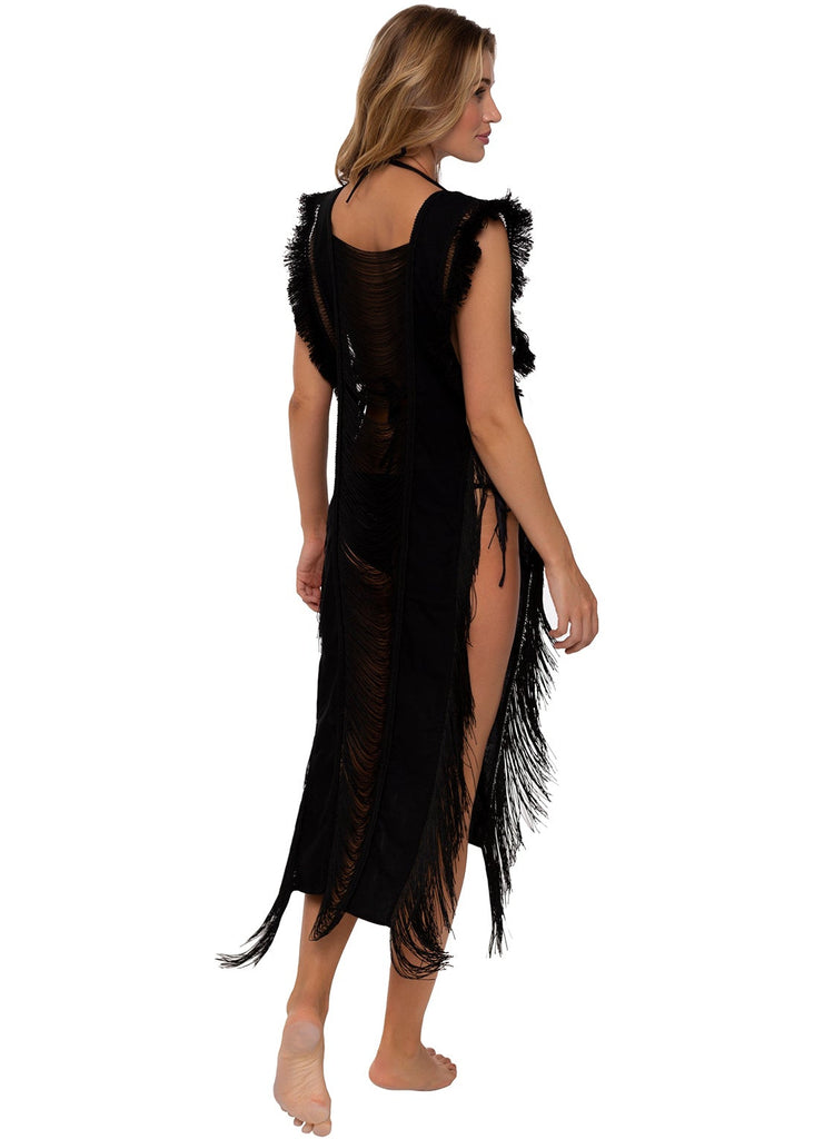 Embrace effortless bohemian glamour with this stunning black fringe beach cover-up. Perfect for your next getaway, this open knit style offers a chic look. Shop the look now!